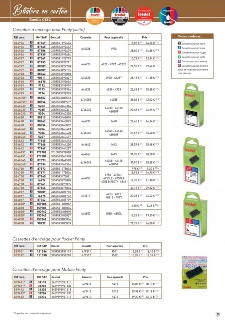 Réf com. Réf SAP Gencod Cassette Pour appareils Prix Codes couleurs :
